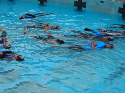 最後には5分間浮き続けるというチャレンジをしました。中にはペットボトルやビート板を使わずに浮き続けた人もいました。