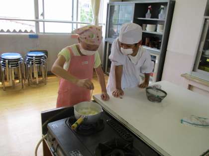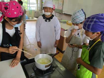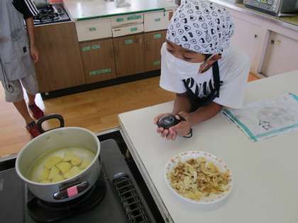 今日は家庭科の授業でじゃがいもをゆでました。みんなで相談しながらゆで時間をきっちりはかっています。