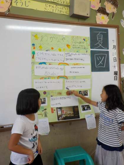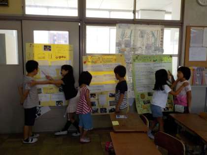 それぞれ,グループで校区たんけんをして分かったことを新聞にまとめました。新聞にまとめた後は,みんなに発表するために,発表の練習をしました。