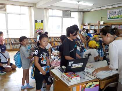 今回は,選書会で子どもたちが選んだ本を配架しました。その本を借りに,50名を越えるたくさんの子どもたちが図書館に来館しました。夏休みも読書に親しみ,充実した時間にしましょうね。