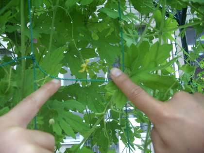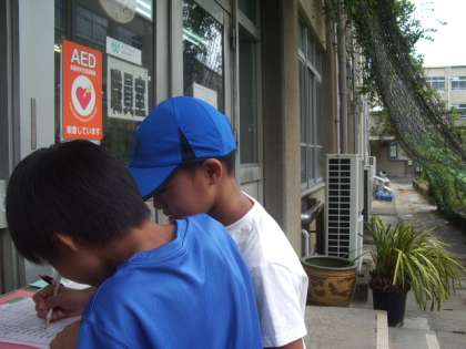 雌花が咲いたあとに,実ができているのを発見!くわしく見ています。観察した後は,職員室前で当番表に名前を書いて帰ります。夏休みに,また友達と会えてうれしそうです。