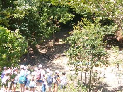 歩き進んでいると、かなり暑くなってきました。水分補給しつつ、班のみんなで励まし合っています。