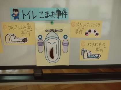 トイレの困った事件と題し,それぞれの事件を解決する方法について考えていきました。(1)うんこはみ出し事件では,足を前に置くこと