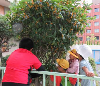 わかば学級みんなで,金木犀の花を見たり,香りをかいだりしました。