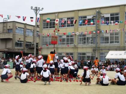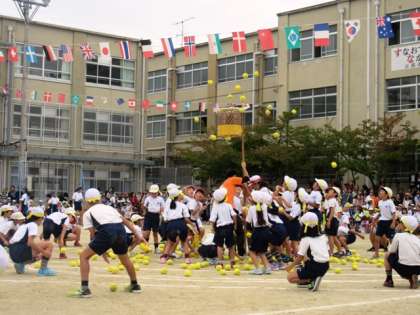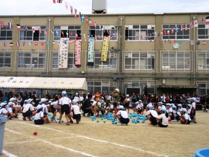 1回戦は低学年,2回戦は高学年,3回戦は全員で玉入れをしました。各色応援も盛り上がっていました。