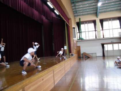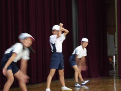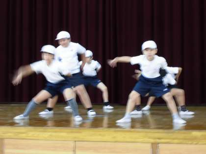 運動会で取り組んだ,ロックソーラン。隊形や踊りのアレンジをしてグループごとに発表会をしました。「どっこいしょ、どっこいしょ。」と鑑賞している子どもたちも掛け声をあげていました。どのグル—プもアイデアいっぱい,元気いっぱいです。