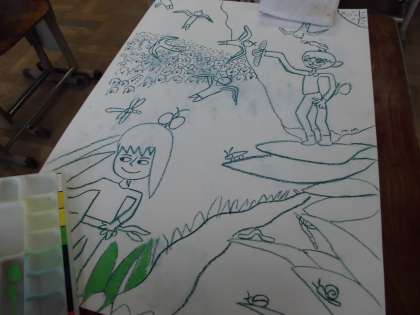 コンテで,下書きをしたあとは彩色をしました。コンテの線は必ず残して,細い筆でていねいにぬっています。鮮やかな色が画用紙の上にのると,まるでお話の世界が今から始まっていくようです。