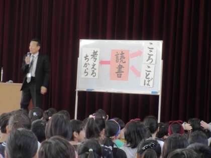 はじめに,校長先生から『読書』について,「今,みなさんは読みかけている本がありますか?読書は,心と言葉を豊かにしてくれます。そして,考える力がつきます。」というお話がありました。