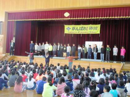 次に,大文字駅伝予選会に向けて,6年生を激励しました。5年生からのエールが送られ,それに続いてみんなで「フレー,フレー,6年生!頑張れ,頑張れ,6年生!!」と声を合わせました。