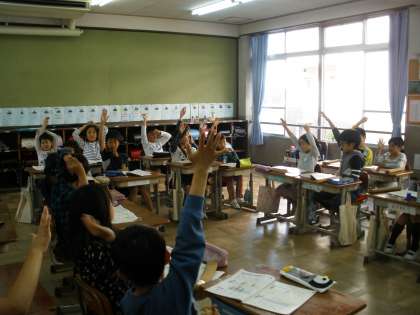 分かれて,歌声がきこえたら手を挙げるという活動を