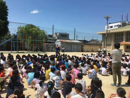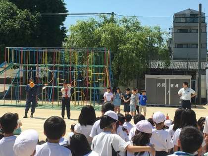 運動場に避難後,校長先生と消防署の方からお話を聞きました。「お(押さない)・は(走らない)・し(喋らない)・も(戻らない)・て(低学年優先)」をしっかりと意識し,短時間で避難することができていました。