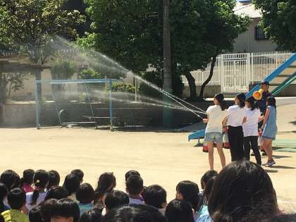 そして,代表の子どもたちと教職員が,消化器の使い方を練習しました。