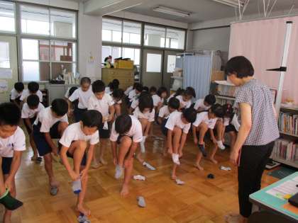 その後,立ったまま靴下をはく練習をしました。