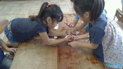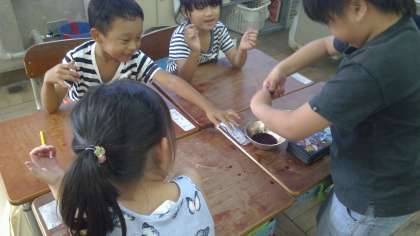 夏休みに育てていた朝顔をたくさん冷凍して頂いていました。今日は、その朝顔を使って色水遊びをしました。体温で凍っている朝顔からしっかり色を出せていました。子どもたちは、色水が出るとすごく喜んでいました。そのあと、自分たちで台紙に張って、かわいい模様をつけて完成しました。自由参観のとき是非完成した作品を見ていただきたいと思います。