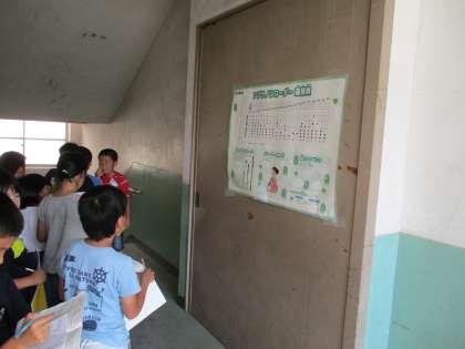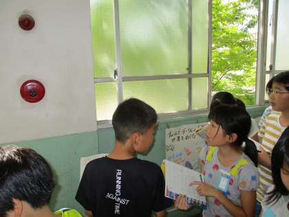 「学校で火事が起きたら大丈夫なのかな?」という子どもたちの疑問から,校内の防火設備を調べて回りました。