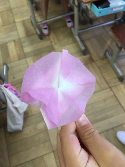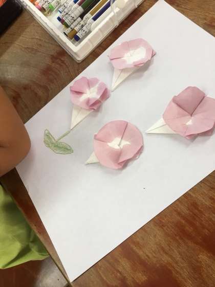 和紙をあさがおに見たてて,色水につけました。きれいなあさがおになったと大喜び!!できたものを紙に貼ってクーピーで絵をかきました。とってもステキなあさがおの作品が完成しました。