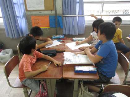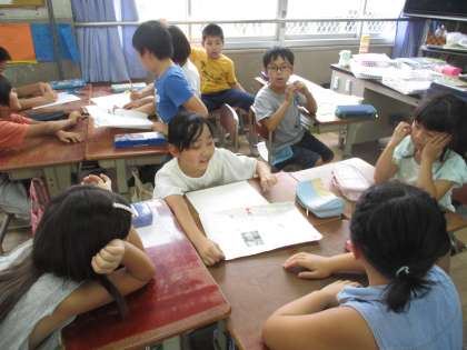 それぞれの係で集まり,4月に書いたポスターを囲んで,