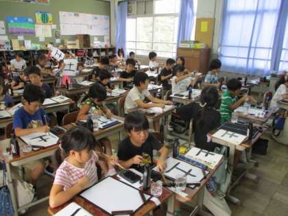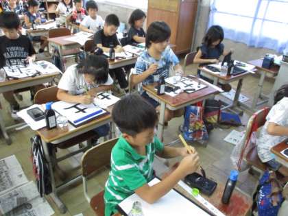 9月13日木曜日に毛筆の授業をしました。三年生から新しく始まった書写は,みんな楽しみです!前回は,横画で漢字の「一・二」を書きました。今回は,「縦画」ということで「土」の字を書きました。「始筆・送筆・終筆」やほ先や筆圧にも気をつけて頑張りました!「土」はきれいに書けても名前を書くことに苦戦している人もいました。みんな集中して頑張ることができていました。