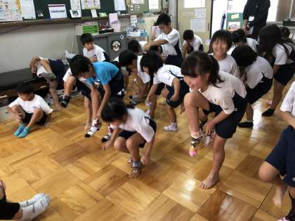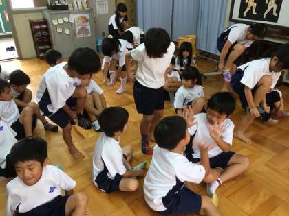 みんなで立ったまま靴下を脱いだり履いたりしました。