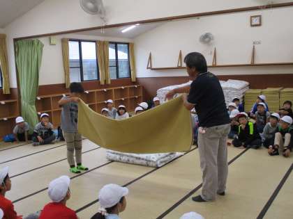 オリエンテーションで,ふとん・シュラフ・シーツの敷き方やたたみ方を教えていただきました。