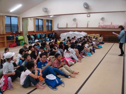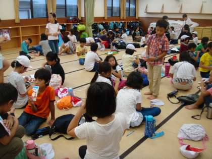 所内ラリーを終えてゴールし,後片付けができたグループからジュースを飲み,ほっこり。その後,ラリーの得点発表を聞いて,わくわくドキドキの子どもたちです。