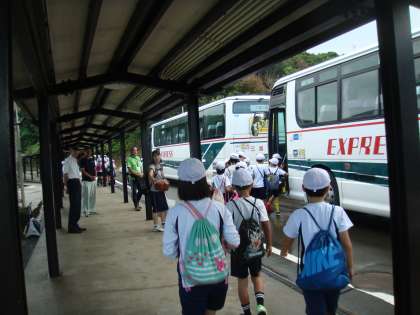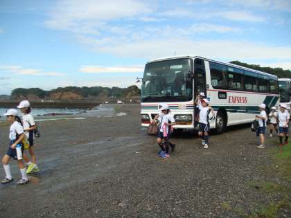 まだまだ小雨が続いていましたが,みんなの願いが通じたようで,バスで麦崎に着く頃には,晴れてきました。海を見るなり,「わぁ,海や。白波や。」「早く,磯観察したい。」と子どもたちは意欲満々でした。