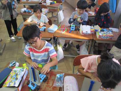 今日は,理科の「風とゴムのはたらき」で使った動く車に