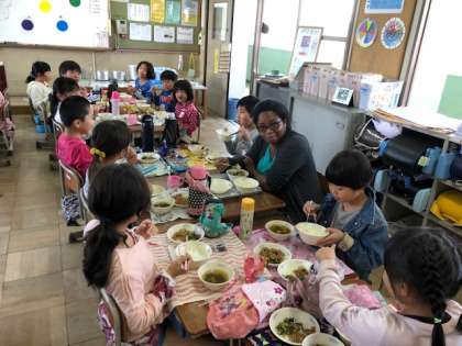 今日は4時間目の授業の後,シエナ先生と一緒に給食を食べました。