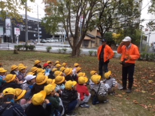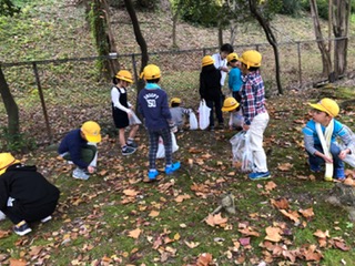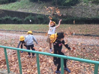今日は生活で「秋見つけ」で西浦南公園に行きました。まず地域の方から秋の生き物や植物についての話を聞かせていただきました。そのあとに、どんぐりや紅葉した葉っぱをたくさん見つけて楽しみました。「先生、見て見て〜!」とみんな自分が見つけた大きな葉っぱをお面のようにして見せてくれたり、綺麗な模様の葉っぱを並べてみたり、秋をたくさん感じていました。