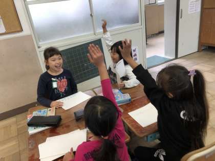 作ったあとは、グループでお互いに作った問題を出し合いました。自分で作った問題を紙芝居で楽しそうに出している姿が印象的でした。