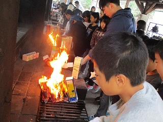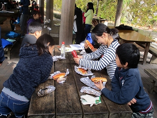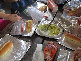 昼食は,準備していただいた材料を使って,自分たちで「パックドッグ」を作りました。パンにキャベツやウインナーを挟んで,牛乳パックに入れて火をつけて焼きます。少し焦げてたころもありましたが,おいしく食べました。