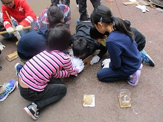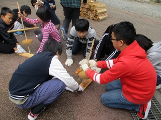 花背山の家の先生達に,マッチやライターを使わずに火をおこす方法を教えてもらいました。木と木を擦り合わせます。班の友達と交代で木を回し続けました。白い煙が出てくると,息を吹きこんで炎をつくりました。