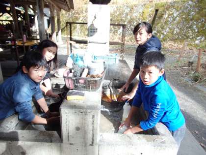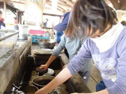 薪で調理をするとお鍋が真っ黒になってしまいます。元のようにきれいなお鍋にもどさなければなりません。クレンザーをつけてたわしやスポンジできれいに研きました。