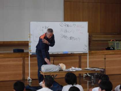伏見消防署の方に来ていただき講習をうけました。救急車が来るまでに,自分たちにもできることがきっとある。「もしも」のときに備えて応急手当を学びました。