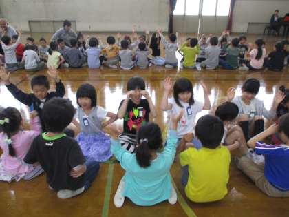 教室で自己紹介をし合った後,体育館で仲良く遊びました。「おちゃらかほい」や「なべなべそこぬけ」,「かもつれっしゃ」をみんなで楽しみました。