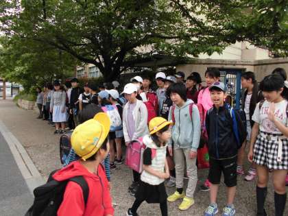 女性会の方と一緒に,朝のあいさつをしました。今日はわかばと6年生の当番の日です。登校班長で先頭に立つ友達に,そして低学年に,にこやかに明るい声で「おはようございます。」とあいさつをしていました。正門前の様子です。