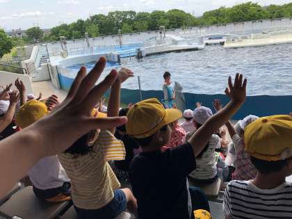 待ちに待ったイルカショーです!!イルカと友達になる方法を教えてもらい,全力で声を出して楽しみました。