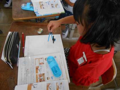算数の「円と球」の学習で,コンパスを使った円のかき方を学習しました。