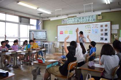 5年生は,花背山の家でバイキング形式で食事をします。そこで,栄養教諭の竹原先生に来ていただきバイキングの良さを知り,栄養について考えながらバランスよく食事をとることについて考えました。授業では,自分が考えた献立をみんなに紹介してくれる人もいました。
