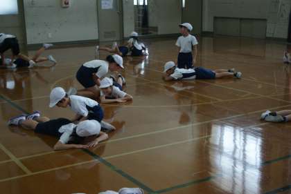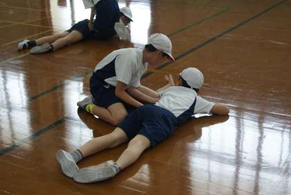体育の時間に体つくり運動をしました。「無駄な抵抗」という名前です。写真のようにうつ伏せの人はひっくり返されないように耐える動きです。