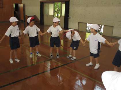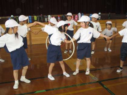 体育科でようぐあそびをしました。今日はフラフープリレーに挑戦しました。