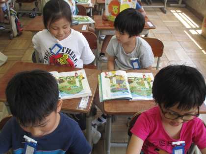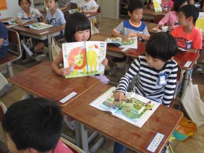 国語科で「えをみてはなそう」という学習をしました。教科書を見て,「なにがいますか。」「〇〇がいます。」「どこにいますか。」「〇〇にいます。」というモデル文を基にして,ペアで話しました。楽しそうに,動物の名前や居場所を話していました。「木にいます。」と言っても,絵にはいろいろな木が描かれていて,どの木の事を言っているのか,分かりやすく説明しなければいけない事も,子どもたちは気づいていました。