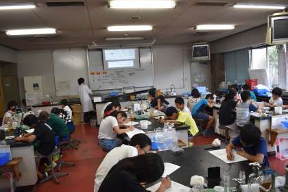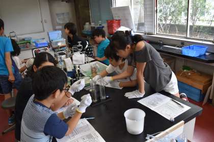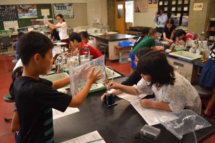 学校で学習した二酸化炭素と石灰水の反応を,ドライアイスからでる気体で行ったり,ドライアイスを水と油それぞれに沈めて反応をみたりしました。どの実験にも子どもたちは興味津々でした。また,その実験結果からどういうことが考えられるのかをしっかりと考察しました。