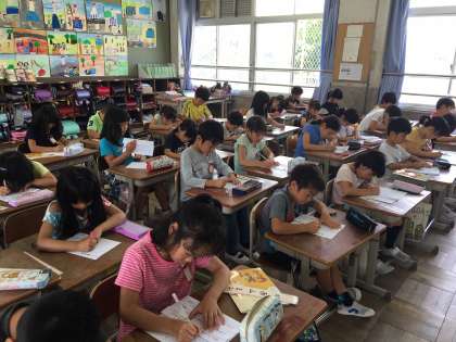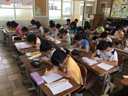 今日は、国語の「俳句を読もう」に出てくる俳句を書写しました。前回の練習で、漢字と平仮名の文字の大きさ、バランスなどを教わりました。子どもたちは、見本を手元に置いて集中して書いていました。2枚清書をして、綺麗に書けた方を教室に掲示したいと思います。普段の授業の文字や宿題の文字も今日のような綺麗な字を書くように心がけてほしいと思います。