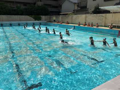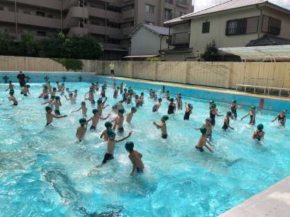 今日から水遊びの学習が始まりました。今年度初めての水あそびだったため,子どもたちはうきうきした様子で水の中を走ったり,水をかけあったりして水に慣れていました。