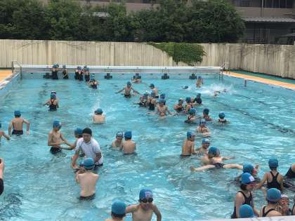 さて,今日は水泳の学習を監視台の上から1時間見学させていただきました。子どもたちがいろんな話をしてくれたり,友達同士いろんな言葉を交わしているのが聞こえてきたりしてなかなか楽しめます。今の自分の泳力を確かめるために,25mを各クラス2人ずつ泳ぐことになった時,