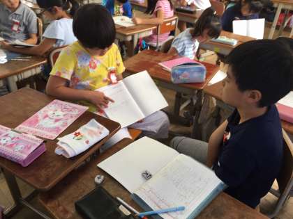 繰り下がりがある3けたの筆算の計算の学習をしています。計算の仕方の順序をまず、次に、という言葉を使いながらお隣の子に説明しています。1時間のどこかで、自分の考えを話す場面を作っています。途中までしかできなかった子も、お隣の子が助けてあげながら最後まで話す姿がたくさん見られました。