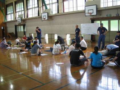 今,体育館で教職員の皆さんは「救急救命講習」を受けています。