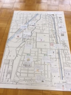 自分たちの住んでいる町のお気に入りを紙に書いて、地図に貼りました。