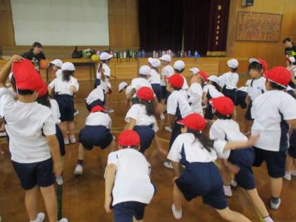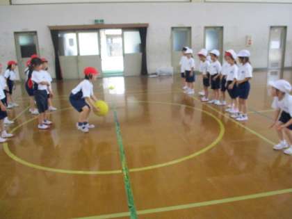 準備運動ではその場駆け足,エアボール投げを行い,初めての転がしドッジに臨みました。転がってくるボールを上手によけたり,キャッチして転がし返したり,とても楽しんでいる様子でした。次は相手チームに勝つためにはどのような作戦があるのか,どのような工夫をすればいいのかなども考え,より楽しくボール遊びの活動が出来ればと思います。